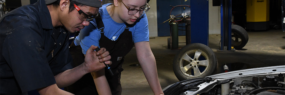 Two students inspecting an automotive part