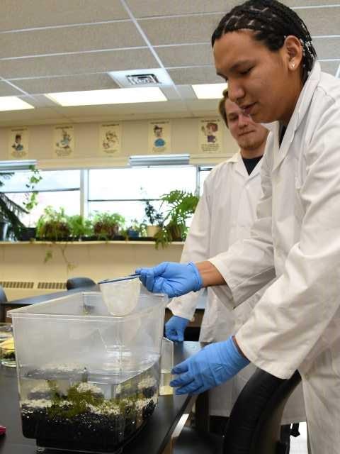 BIO 108 student sets up an aquarium to investigate aspects that contribute to snail habitat preferences.