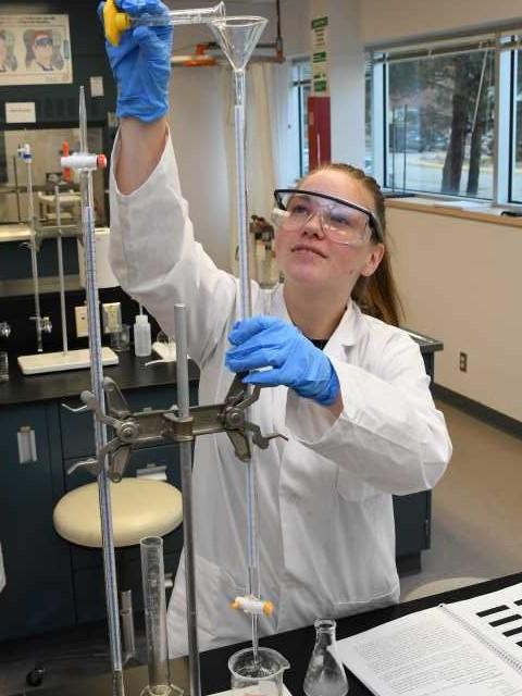 A student in BIO 107 uses a micropipette to transfer a small volume of reagent between vessels.