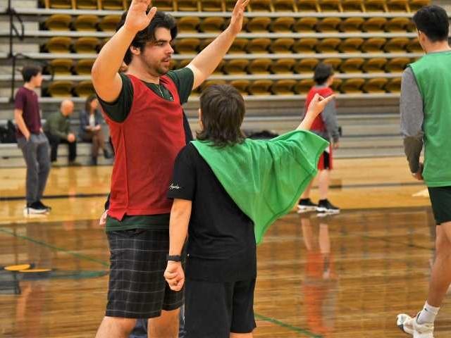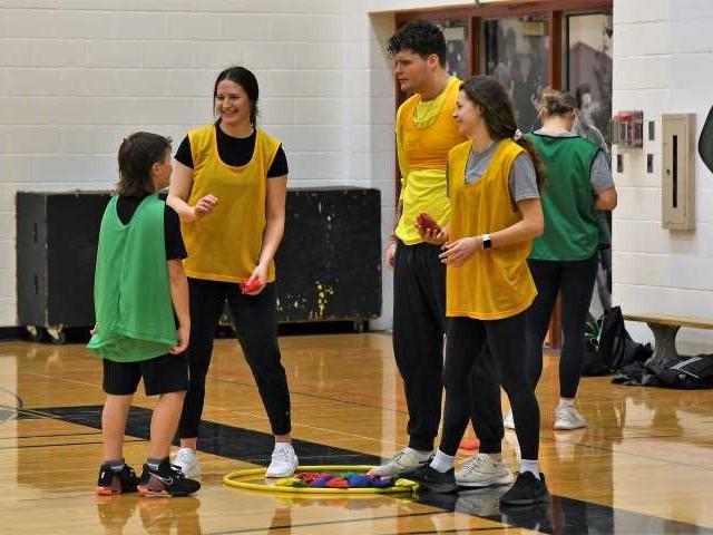 Colored pinnies identify teams and games when local secondary students visit Lakeland PEDS classes.