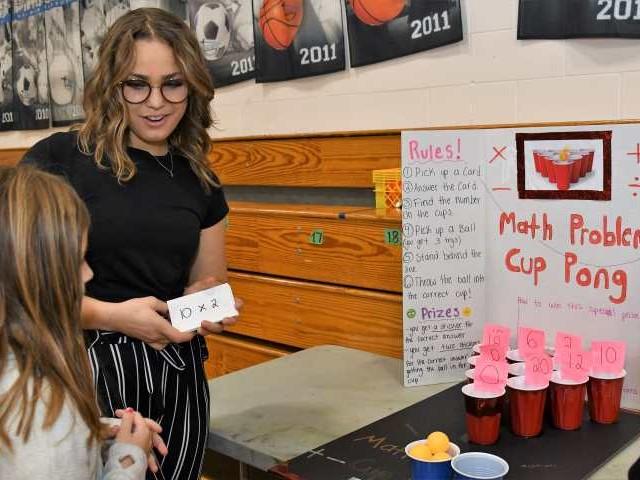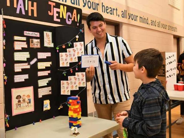 Combining math and Jenga was one of the many Math Fair games developed by a Lakeland university transfer student.