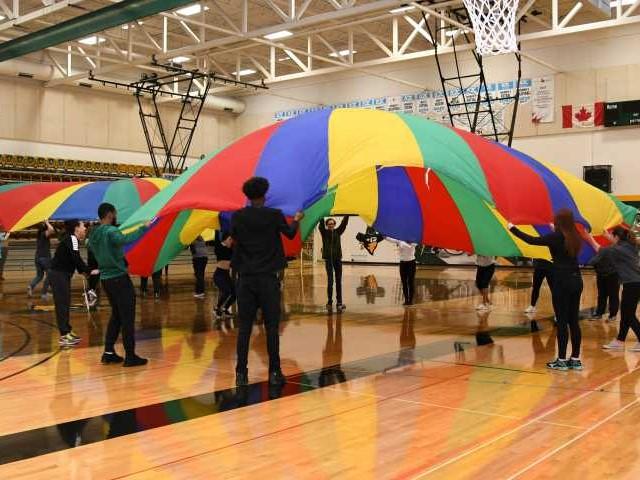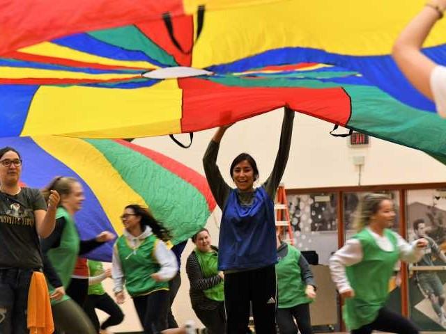 Lakeland students try parachute games themselves in their PEDS 293 class - Introduction to Movement for Children aged 5 to 12