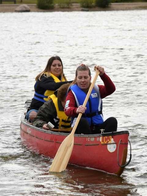 BIO 208 ecology students canoe out on the lake at Bud Miller Park to measure dissolved oxygen, temperature and other parameters in the water column.