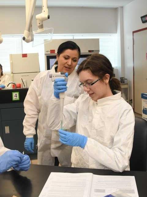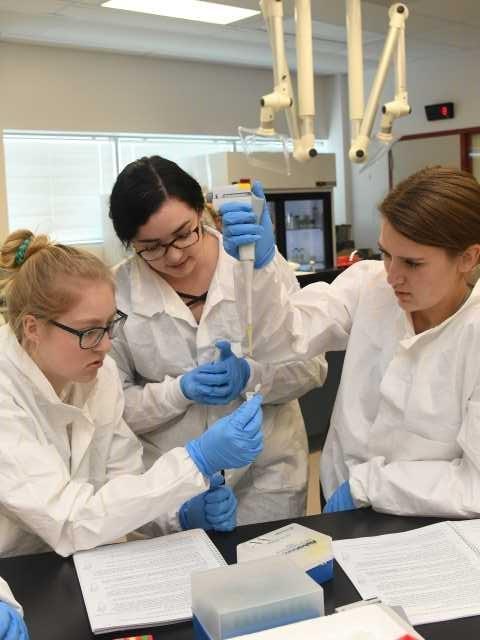In BIO 207, genetics lab students use a micropipette to load a bacterial DNA sample in an agarose gel.