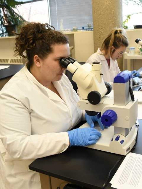 BIO 108 student counts brine shrimp with a stereomicroscope during an ecology lab experiment.