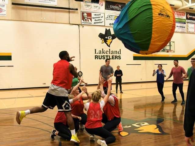 Launching an earth ball is a team activity Lakeland students try during their PEDS class.
