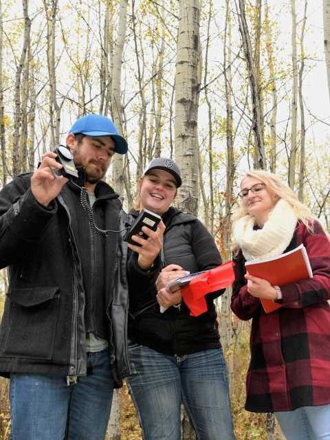 BIO 208 ecology students using a photometer (light meter) in the deciduous forest of Bud Miller Park.
